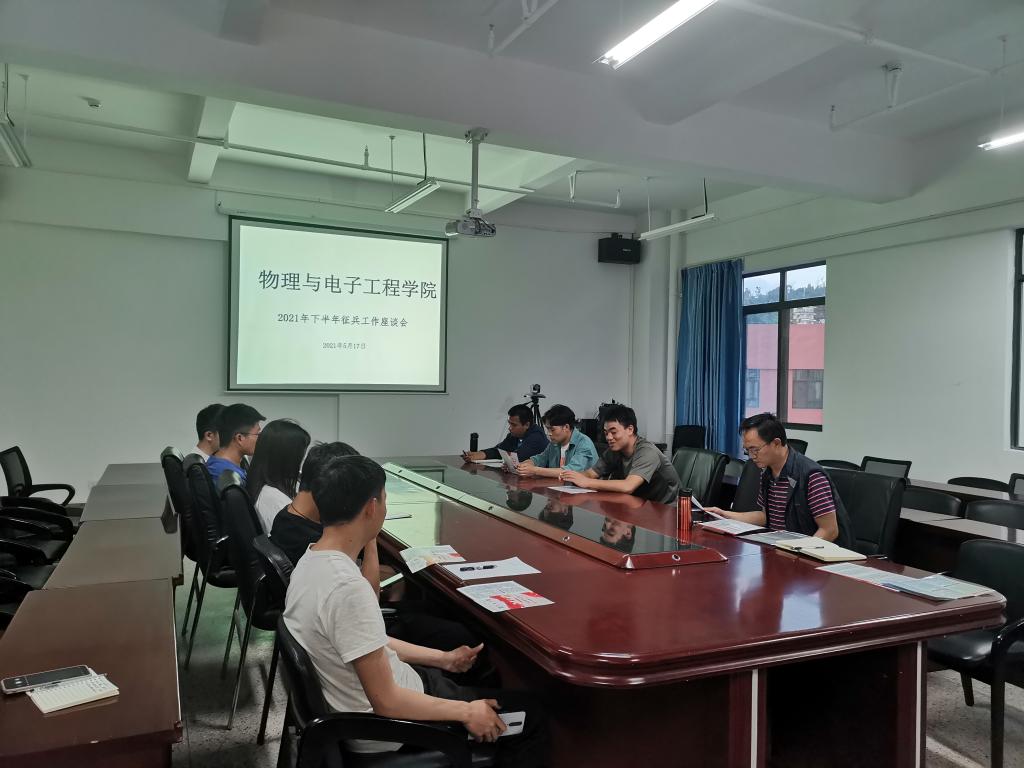 为响应国家号召,鼓励我院大学生积极参军入伍,5月17日下午7:00,物理与电子工程学院在实训大楼B-101会议室召开2021年下半年征兵工作座谈会。学院刘飞书记、辅导员孙婷、熊国庆、来自2018级电气工程及其自动化班的两位退伍军人学生代表以及多位有参军意向的同学参加了本次座谈会。
