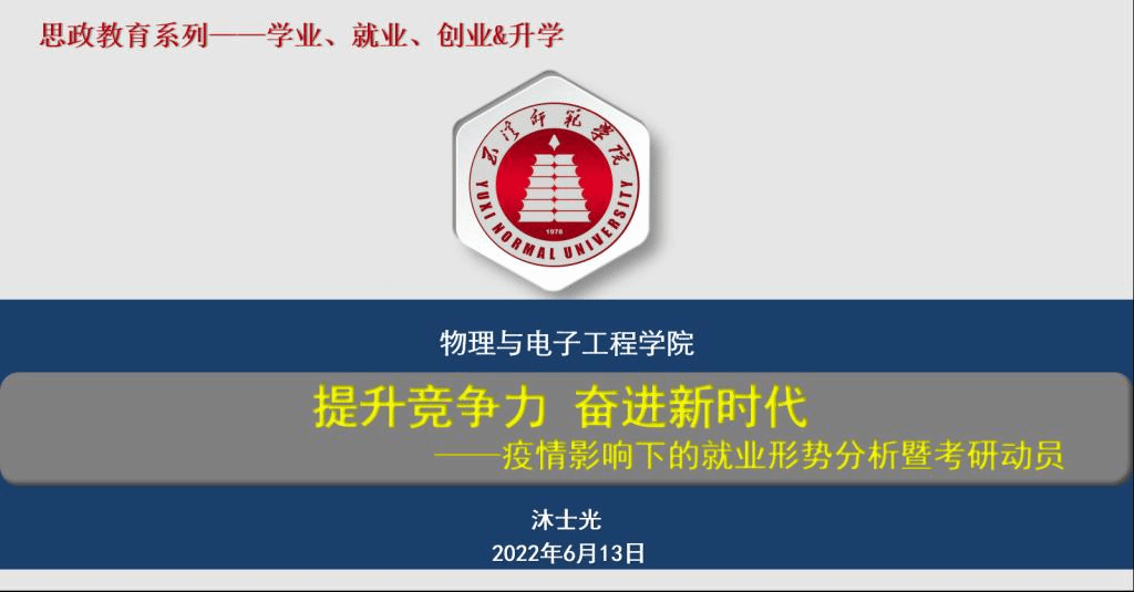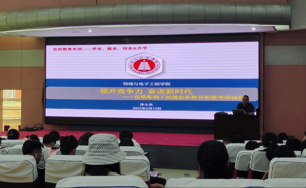 为了进一步加强同学们对当前大学生就业形势的认识,增强就业观念,提高自身竞争能力,6月13日下午3点,物理与电子工程学院在多元学术厅召开了“提升竞争力 奋进新时代--疫情影响下的就业形势分析暨考研动员”主题讲座。本次讲座由学院党委副书记沐士光主讲,2019级全体学生参加。