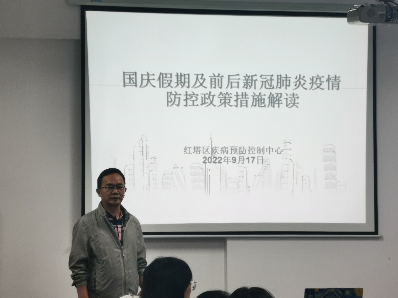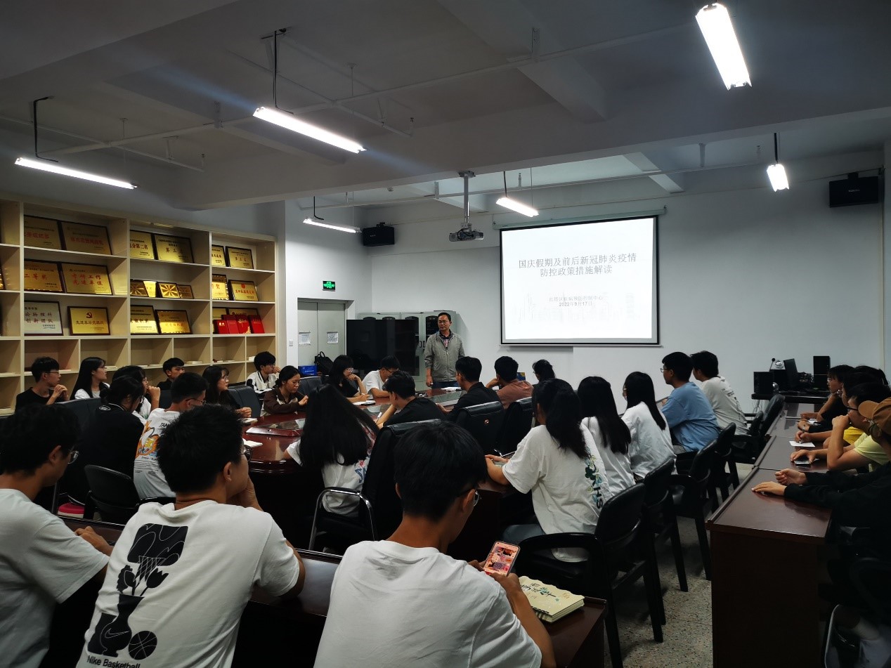 刘飞书记分析了近期的疫情状况,对国庆假期及前后新冠肺炎疫情防控政策措施进行分析和讲解,强调当前国内疫情呈现多点散发、多地频发、局部暴发态势,周边省份疫情防控形势严峻复杂,在国庆长假期间,全院师生必须认真贯彻落实“外防输入、内防反弹”的总策略和“动态清零”的总方针。