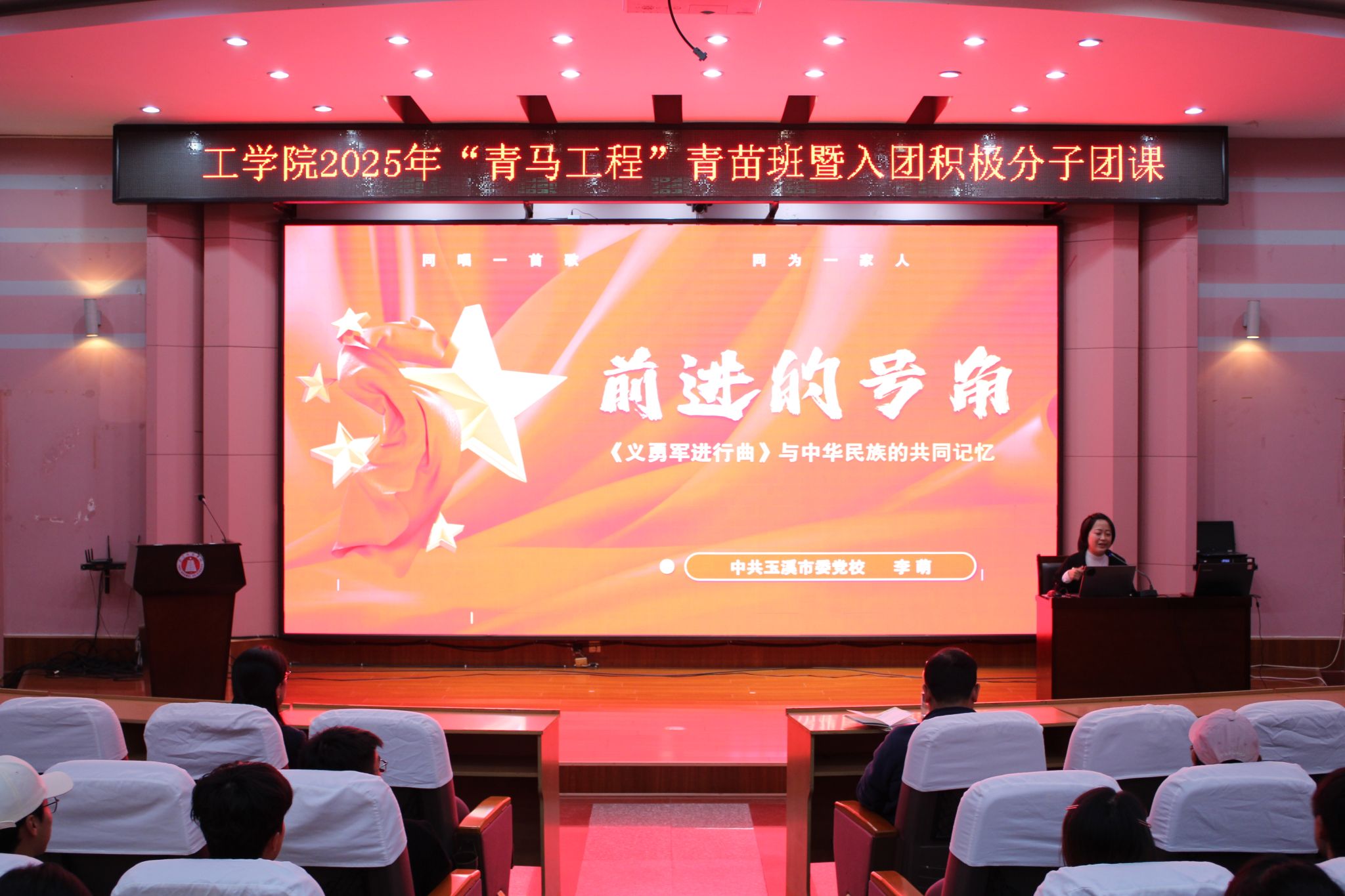 2025年10月23日19时,工学院于科学讲堂成功举办2025年“青马工程”青苗班暨入团积极分子团课第二讲。本次讲座以“前进的号角——《义勇军进行曲》与中华民族的共同记忆”为主题,特邀中共玉溪市委党校李萌副教授主讲。工学院党委副书记杨扬主持。全体青马班学员及入团积极分子参与学习。