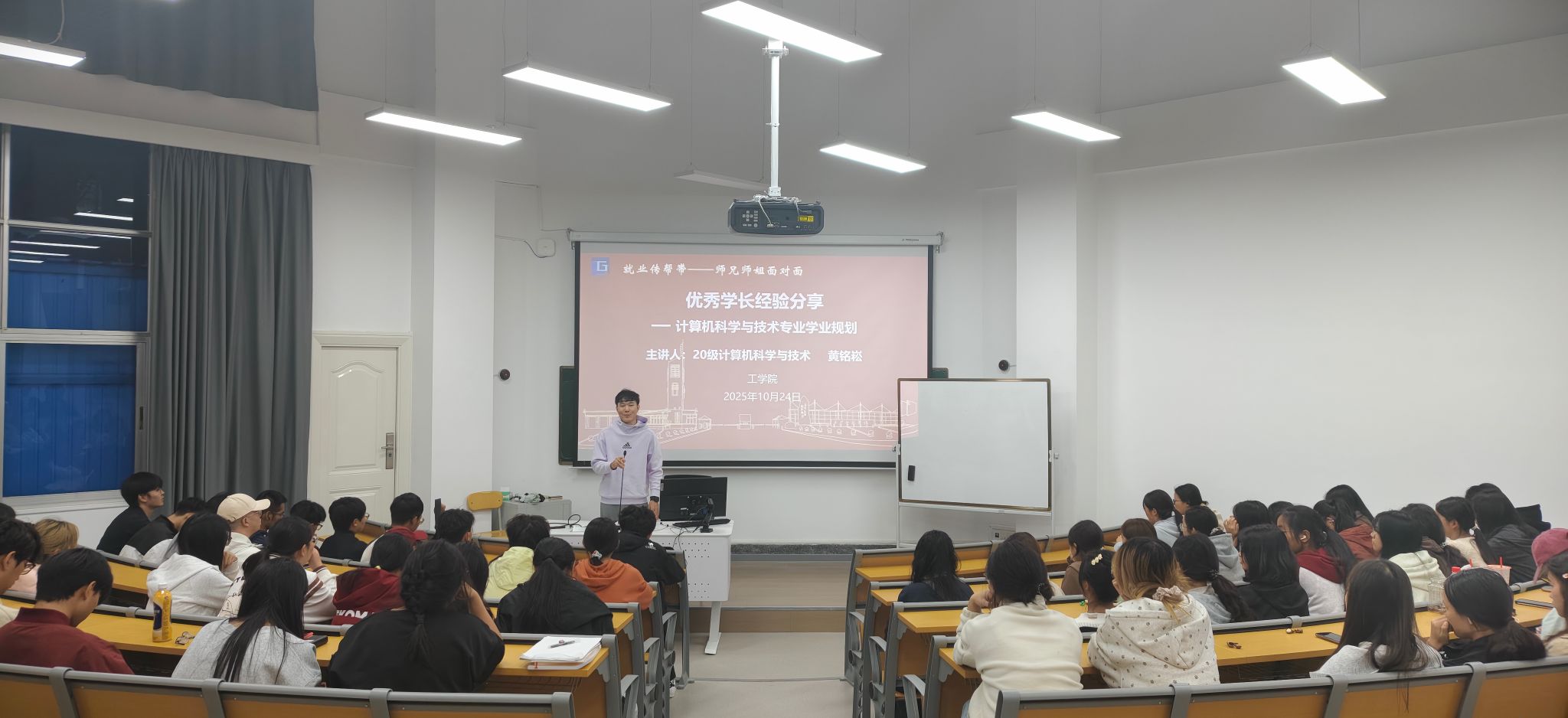 为充分发挥优秀学子的榜样引领和朋辈教育作用,帮助低年级学生明晰学业规划、树立正确的就业观,10月24日晚,工学院成功举办了“就业传帮带-师兄师姐面对面”系列活动之优秀学长经验分享交流会。玉溪市峨山县委宣传部、2020级计算机科学与技术专业优秀学生黄铭崧应邀为学弟学妹们分享心路成长历程。2024级、2025级全体计算机科学与技术专业学生和辅导员詹婷参加交流。交流由工学院党委副书记杨扬主持。