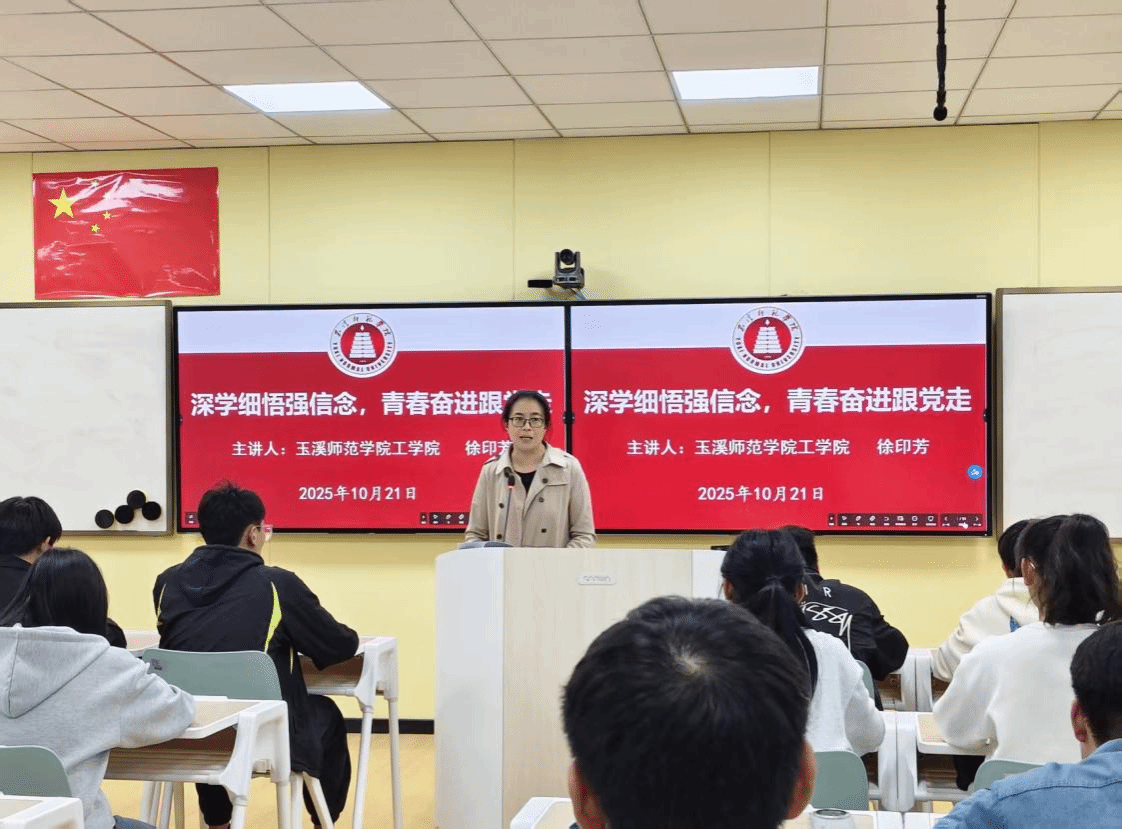 为深入学习贯彻习近平新时代中国特色社会主义思想,贯彻落实习近平关于青年工作的重要思想,强化团员青年的思想政治引领,2025年10月21日晚上,工学院党委书记徐印芳在11教108教室为“青马工程”青苗班学员和入团积极分子开展首场讲座。讲座由工学院团委书记苏明超主持。