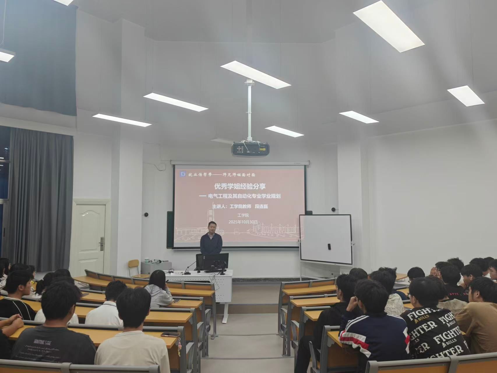 为助力学生明晰职业规划,把握学习方向,10月30日晚,工学院成功举办了“就业传帮带-师兄师姐面对面”系列活动之优秀学姐经验分享交流会。本次交流会由我院2013级电气工程及自动化专业优秀校友、现任职于玉溪师范学院的段连磊主讲,段老师以独特的“教师”与“学姐”双重视角,为24、25级电气工程及其自动化专业的学弟学妹们带来了一场内容丰富、干货满满的经验分享,交流会由工学院党委副书记杨扬主持。