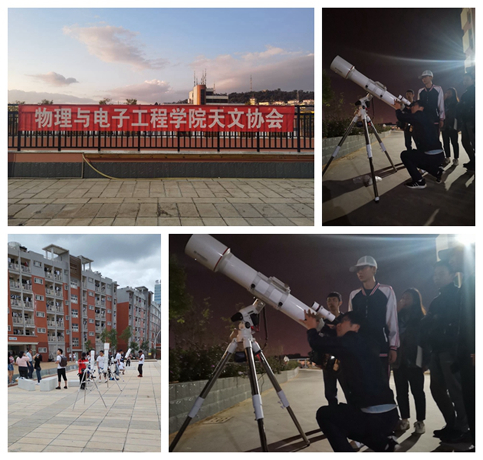 2020年10月24日晚上19点00分-21点30分,玉溪师范学院的大学生活动中心热闹非凡,其物理与电子工程学院天文协会(简称物电天文协会)自成立以来第一次大型观测科普活动在协办单位大学生记者团、物理与电子工程青年志愿者协会的共同协办下顺利开展,天文协会指导老师李怀珍博士与高全归博士等多位老师参与此次观测活动。