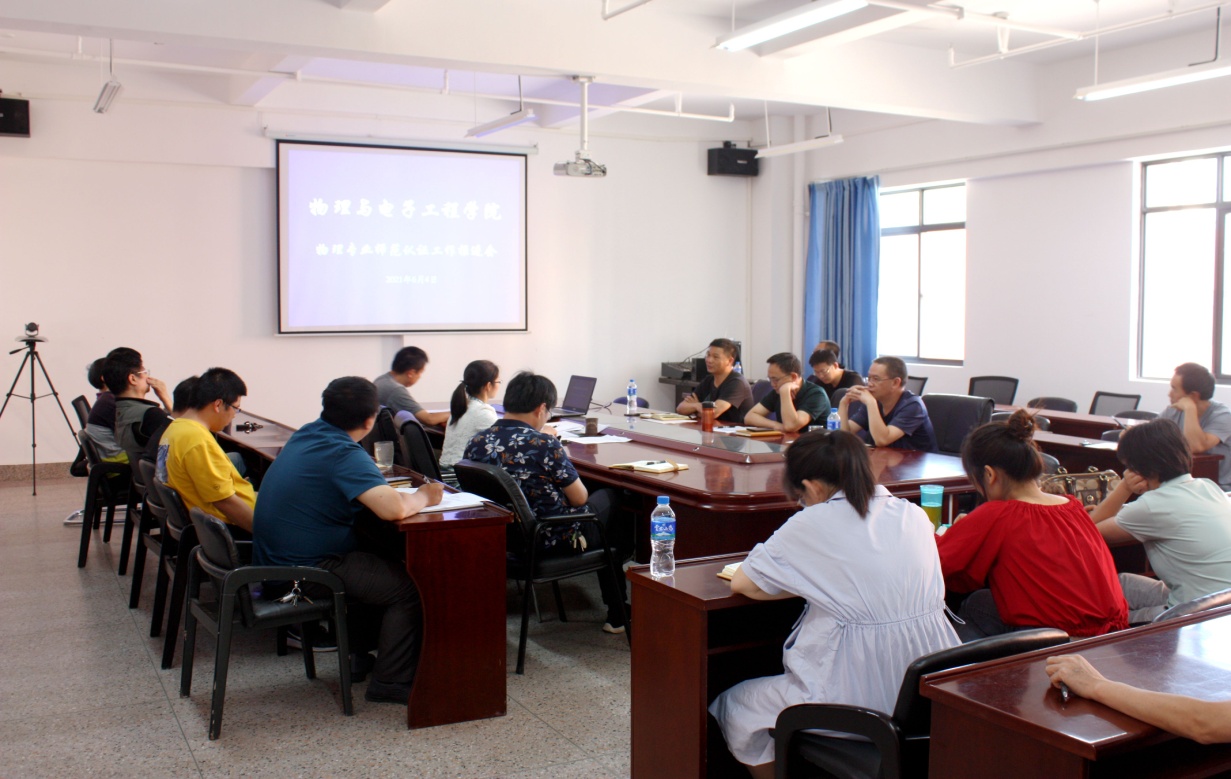6月4日下午3点,物理与电子工程学院在实训大楼B-101会议室召开物理学专业师范认证第三阶段工作会议,物理学专业认证工作领导小组全体成员和物理系全体教师参加了会议,会议由物电学院院长羊波主持。
