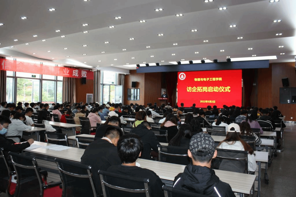 面对“经济放缓、产业转型升级、高校毕业生就业总量突破千万、新冠肺炎疫情影响等”严峻的就业形势,为贯彻落实《玉溪师范学院关于落实云南省“三好三实”要求促进2022届毕业生就业工作实施方案》要求,建立“协同育人”机制,想方设法开拓就业岗位,拓宽毕业生就业渠道,高质量促进毕业生充分就业,2022年5月2日,“物理与电子工程学院访企拓岗启动仪式”在大学生活动中心召开,玉溪师范学院党委副书记姜家雄、企业代表玉溪仙福钢铁集团技术顾问、正高级工程师杨素波、物理与电子工程学院党委书记刘飞、院长羊波、辅导员、毕业班班主任、22届毕业班学生和19级各班学生代表200余人参加启动仪式,仪式由学院党委副书记沐士光主持。