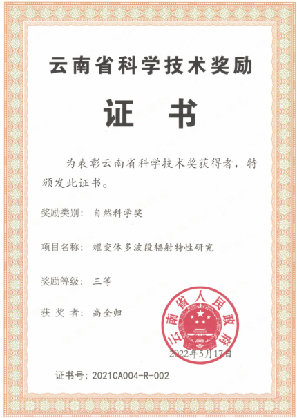 2022年7月7日上午,2021年度云南省科学技术奖励大会在昆明海埂会堂举行,大会表彰了2021年在云南省科学技术进步、经济社会发展中做出突出贡献的科学技术人员和组织。由我院李怀珍教授、高全归副教授牵头的科研成果“耀变体多波段辐射特性研究”荣获自然科学奖三等奖。这是我校在省级科学技术奖励方面取得的重大突破,该成果高度支撑了我校物理学学科建设。
