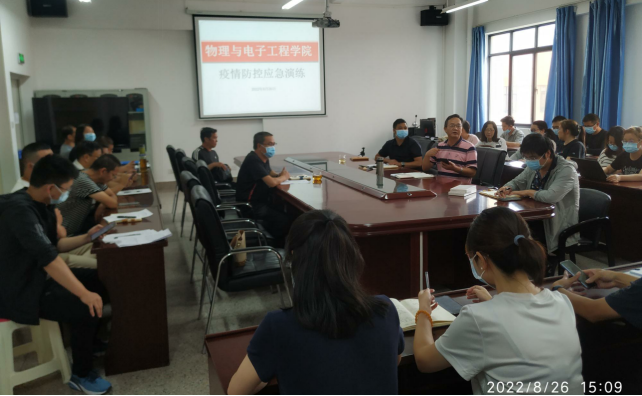 为了进一步强化突发疫情应急处置机制,明确疫情应急指挥、工作流程、岗位职责和协调联控机制,切实保障全院师生身体健康和生命安全,维护学院正常教育教学秩序,8月26日15:00,全院教师在实训大楼B101会议室(模拟教室)、B102(模拟隔离点)开展物理与电子工程学院2022年秋季学期疫情防控应急演练,全院教职工参加本次演练,演练由学院党委副书记主持。