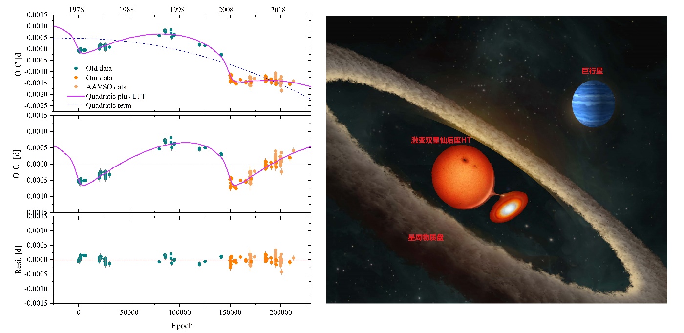 左图显示由于星周物质盘和巨行星伴星的存在,仙后座HT的轨道周期呈现出快速衰减(蓝色虚线)和周期性振荡(玫红色实线)。右图是由激变双星仙后座HT及其星周盘和巨行星伴星构成的特殊系统想象图。