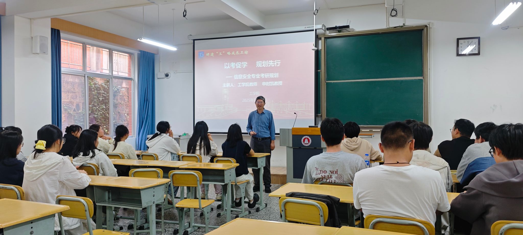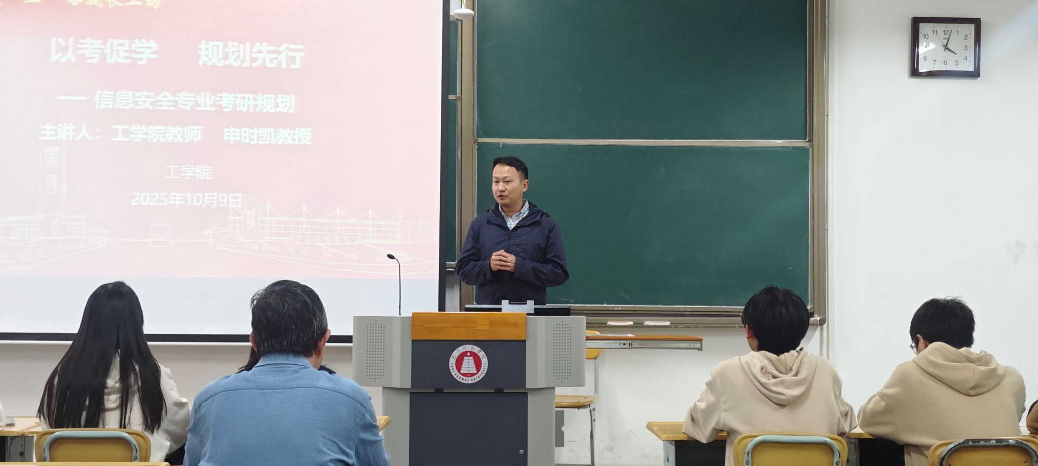 为帮助信息安全专业学子明确考研方向、科学规划备考路径,10 月 9 日,工学院在 13-102举办 “以考促学 规划先行 —— 信息安全专业考研规划” 专题讲座。本次讲座特邀工学院银龄教师申时凯教授主讲,为在场学子带来兼具思想深度与实践指导意义的考研分享,讲座由杨扬副书记主持,辅导员詹婷,38名信息安全学生参加。