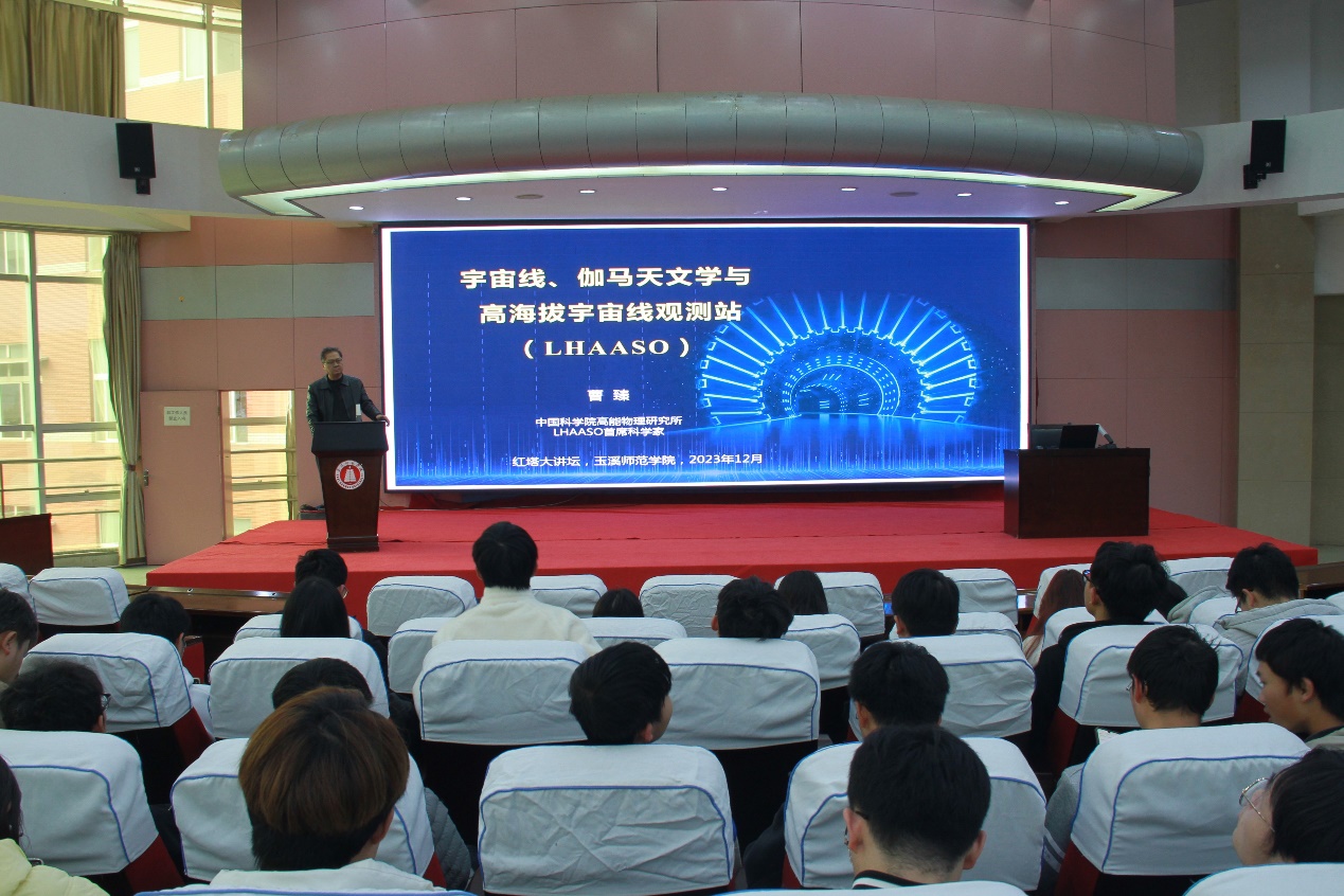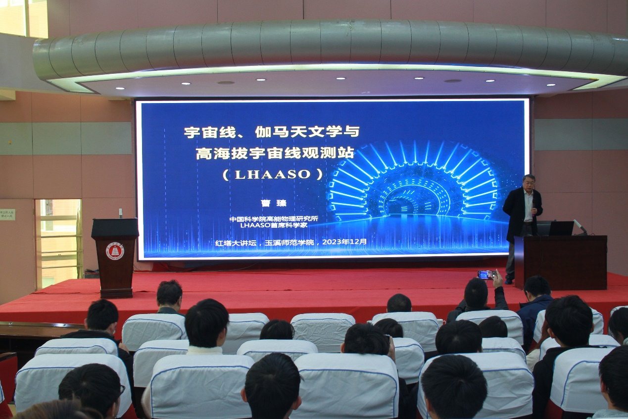 2023年12月29日,中国科学院院士、LHAASO首席科学家、中国科学院高能物理研究所曹臻研究员应邀做客我校红塔讲坛,在我校图书馆多元学术厅为我校师生作了题为 “宇宙线、伽马天文学与高海拔宇宙线观测站(LHAASO)”的学术报告。报告会由玉溪师范学院副校长李明教授主持,物理与电子工程学院教师和学生400余人参加了此次报告会。