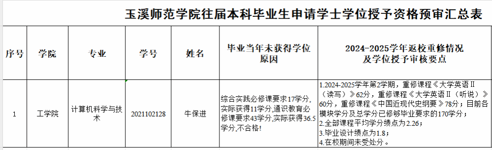 2025年9月18日,工学院学位委员会对往届本科毕业生申请学士学位授予资格进行预审,经审核:该生各模块学分及总学分已修够毕业要求的170学分,全部课程平均学分绩点为2.26,毕业设计绩点1.8,在校期间未受处分。对照学位授予规定,工学院学士学位评定分委员会初审意见为:拟同意,详情如下: