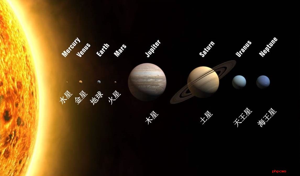 八大行星与太阳的大小对比(行星与太阳的距离并未按实际比例画出)